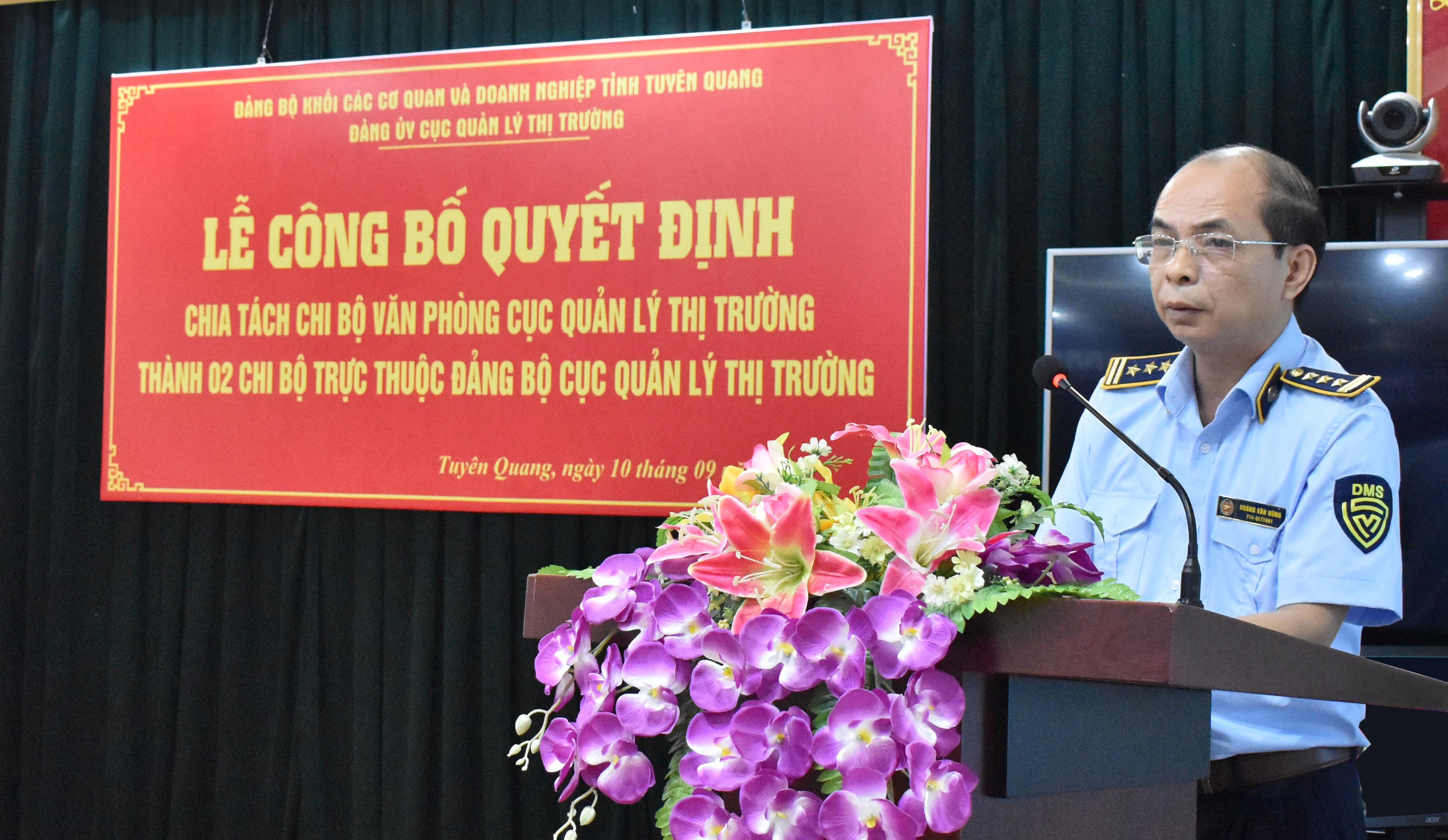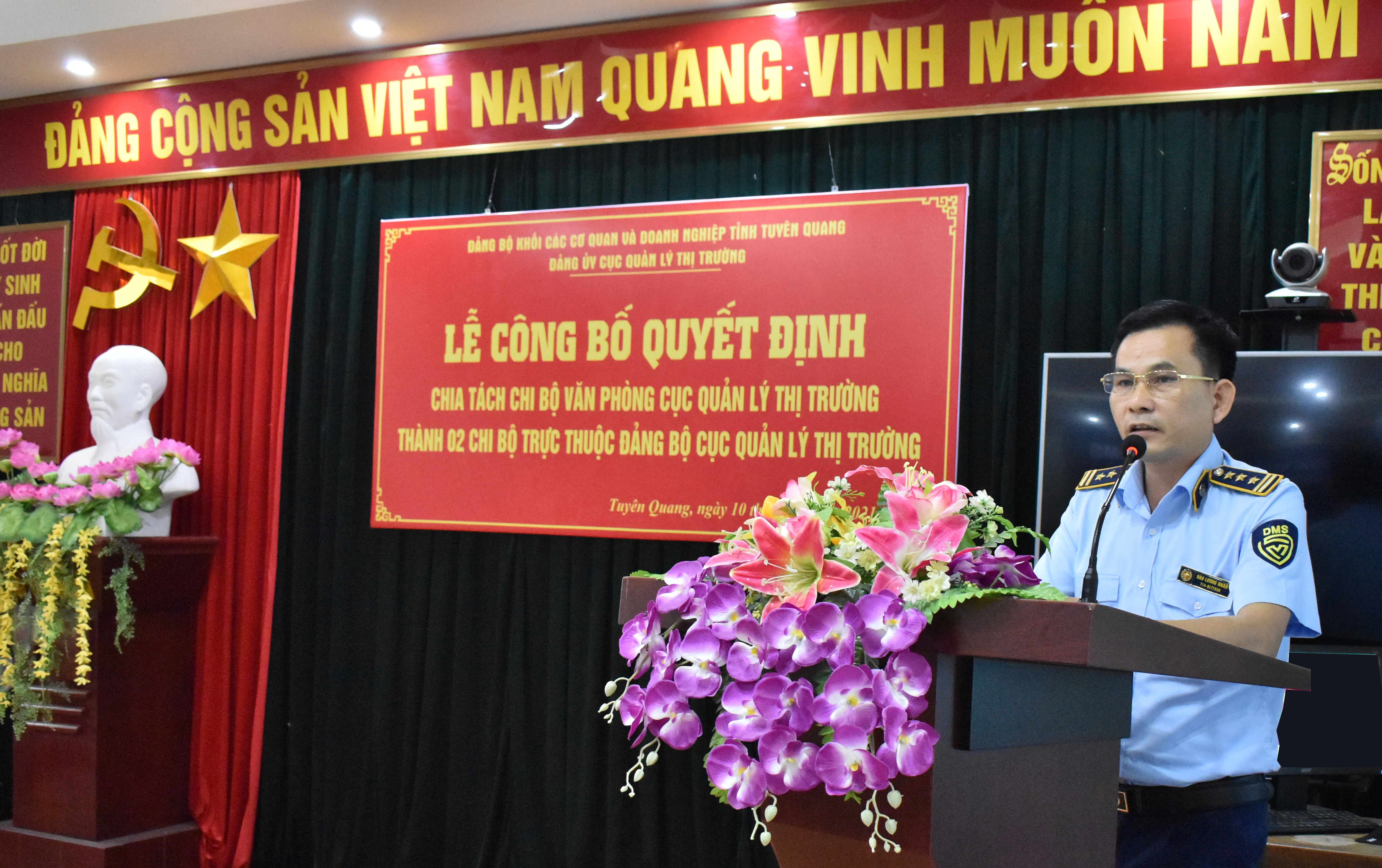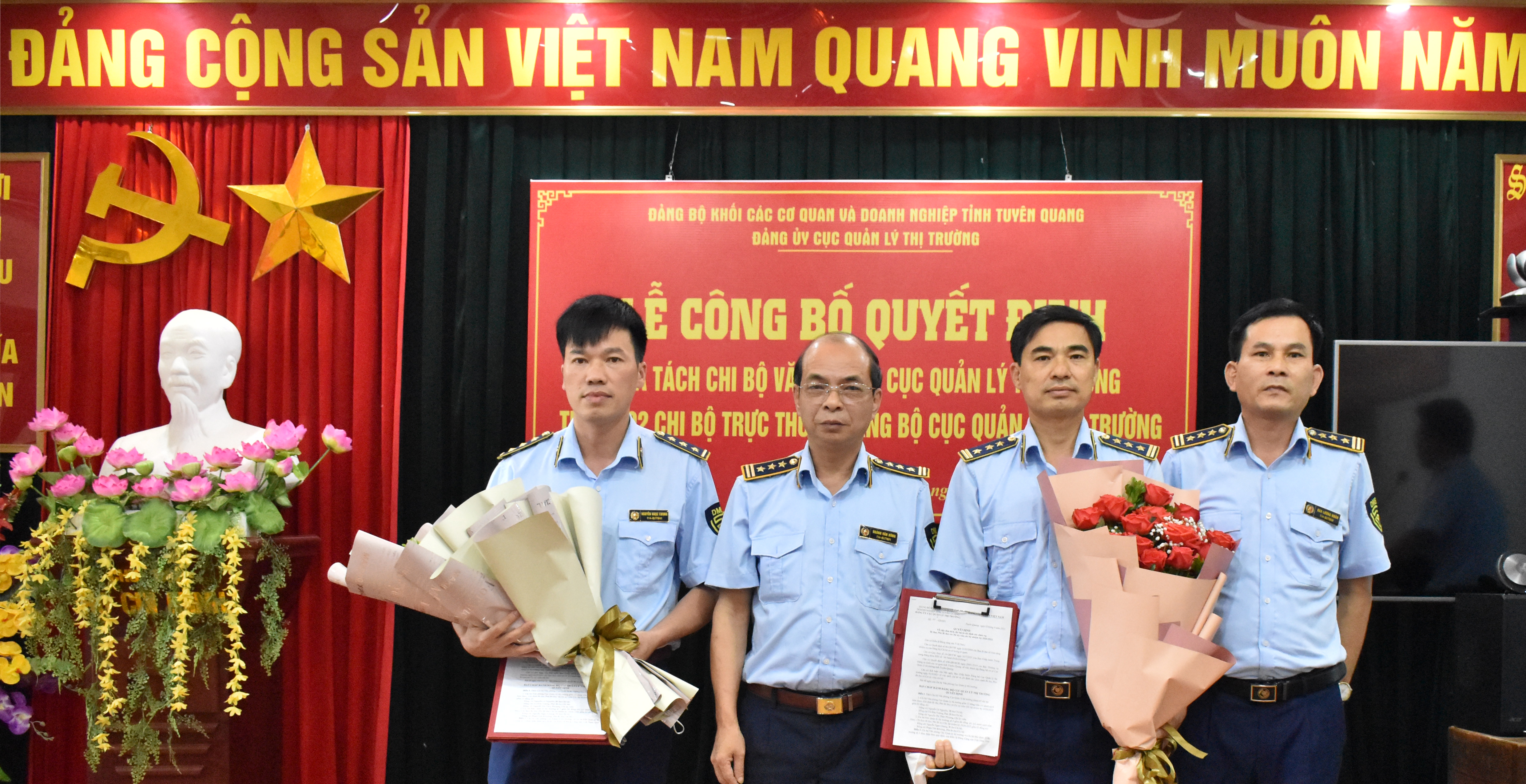 Thực hiện quyết định số 04-QĐ/ĐU ngày 08 tháng 9 năm 2021 của Đảng ủy Cục Quản lý thị trường về việc chia tách chi bộ và chỉ định các chức vụ Bí thư, Phó Bí thư và Chi ủy viên chi bộ nhiệm kỳ 2020-2022. Ngày 10/9/2021, Đảng ủy Cục QLTT Tuyên Quang long trọng tổ chức Lễ công bố Quyết định chia tách Chi bộ Văn phòng Cục Quản lý thị trường thành 02 chi bộ trực thuộc Đảng bộ Cục Quản lý thị trường.