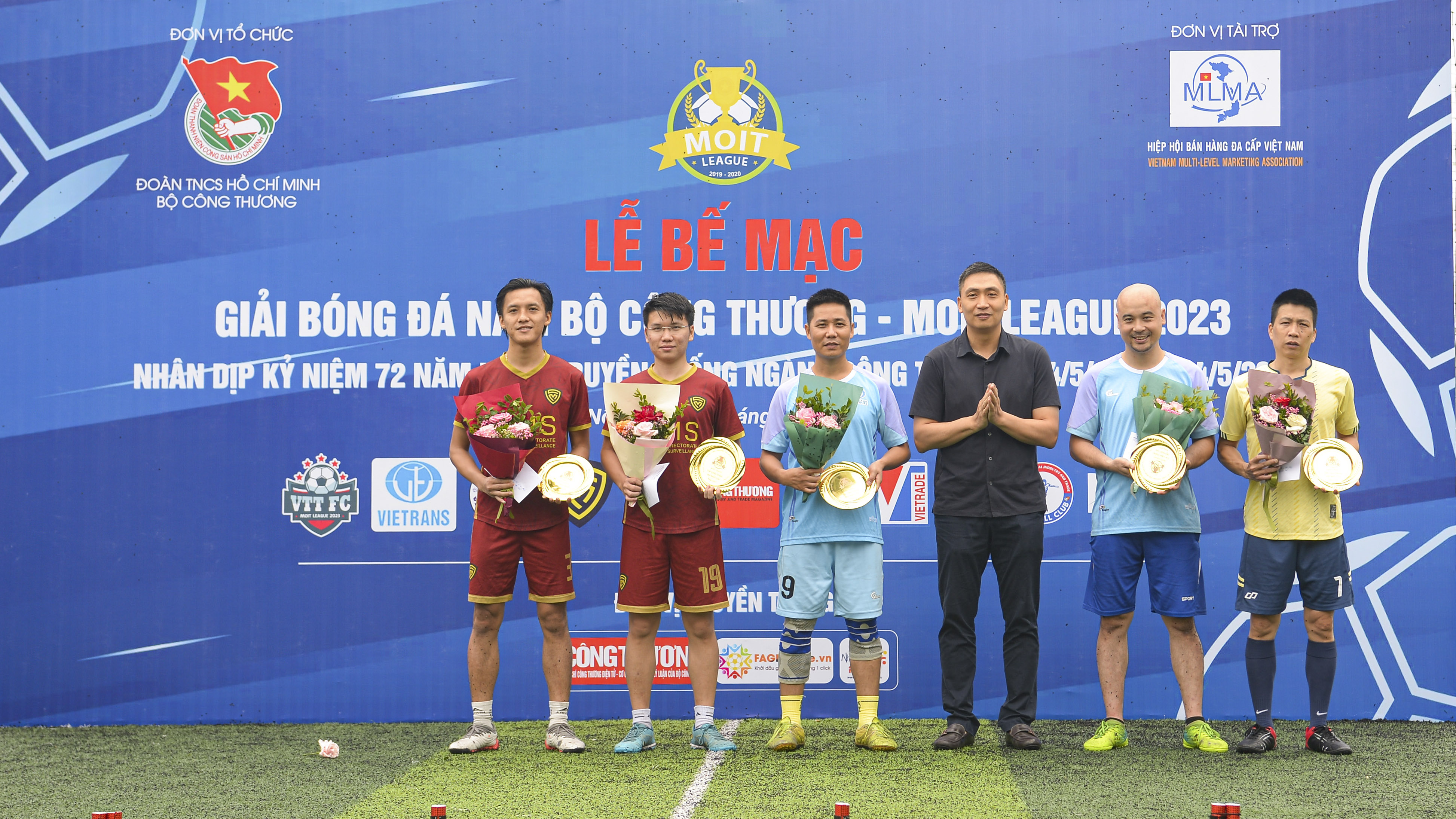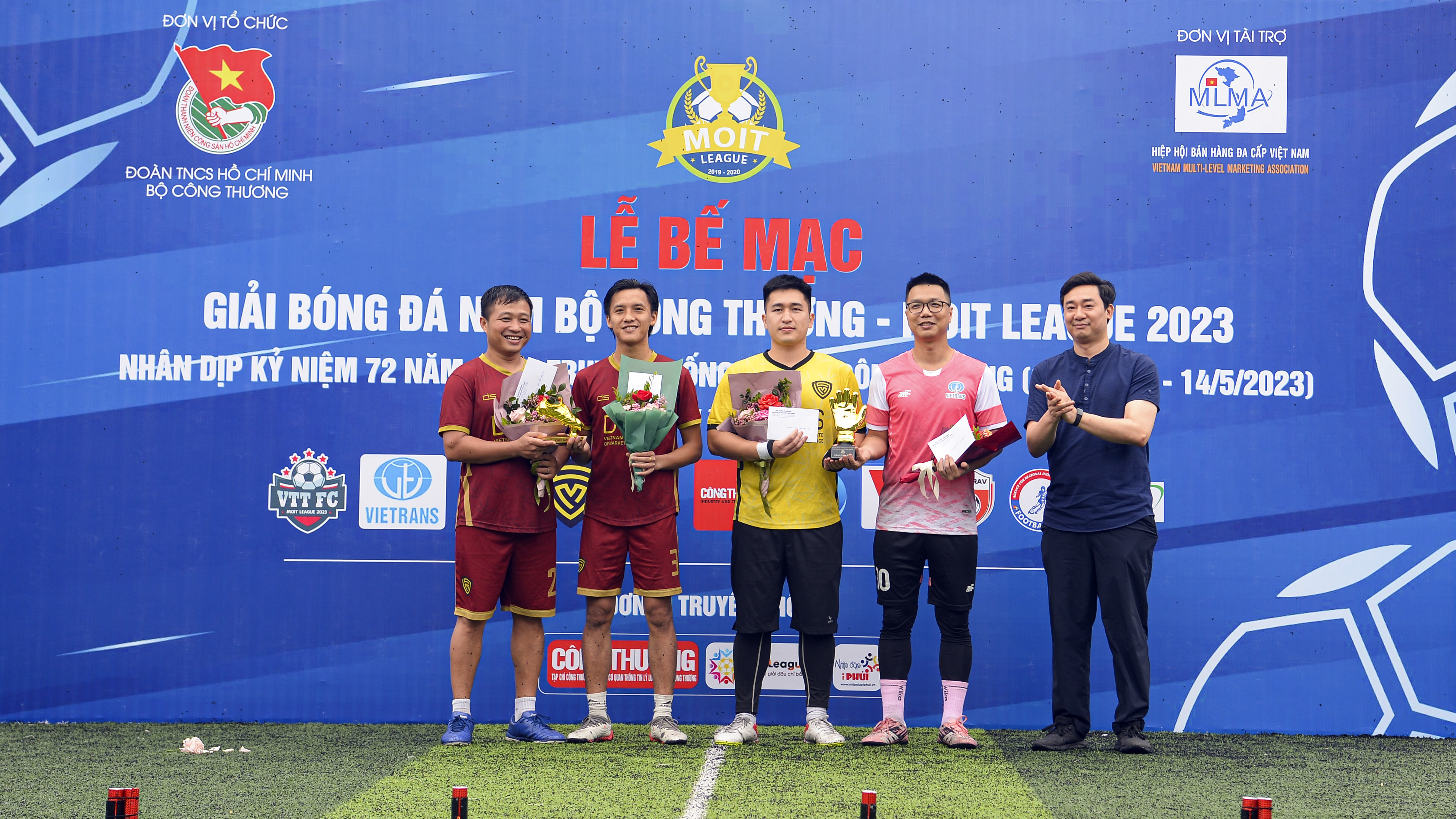 Chủ tịch Công đoàn Bộ Công Thương Nguyễn Minh Huệ, Chủ tịch Ủy ban Cạnh tranh Quốc gia Lê Triệu Dũng, Bí thư Đoàn Thanh niên Bộ Công Thương Phạm Khắc Huy trao Cup vàng và cờ thi đua cho Đội bóng Cơ quan Tổng cục QLTT