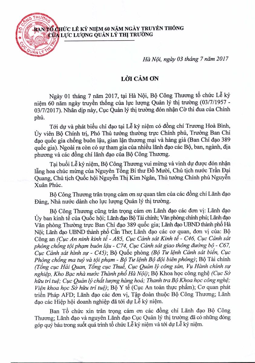 Lời cảm ơn của Ban tổ chức Lễ kỷ niệm 60 năm ngày truyền thống của lực lượng Quản lý thị trường