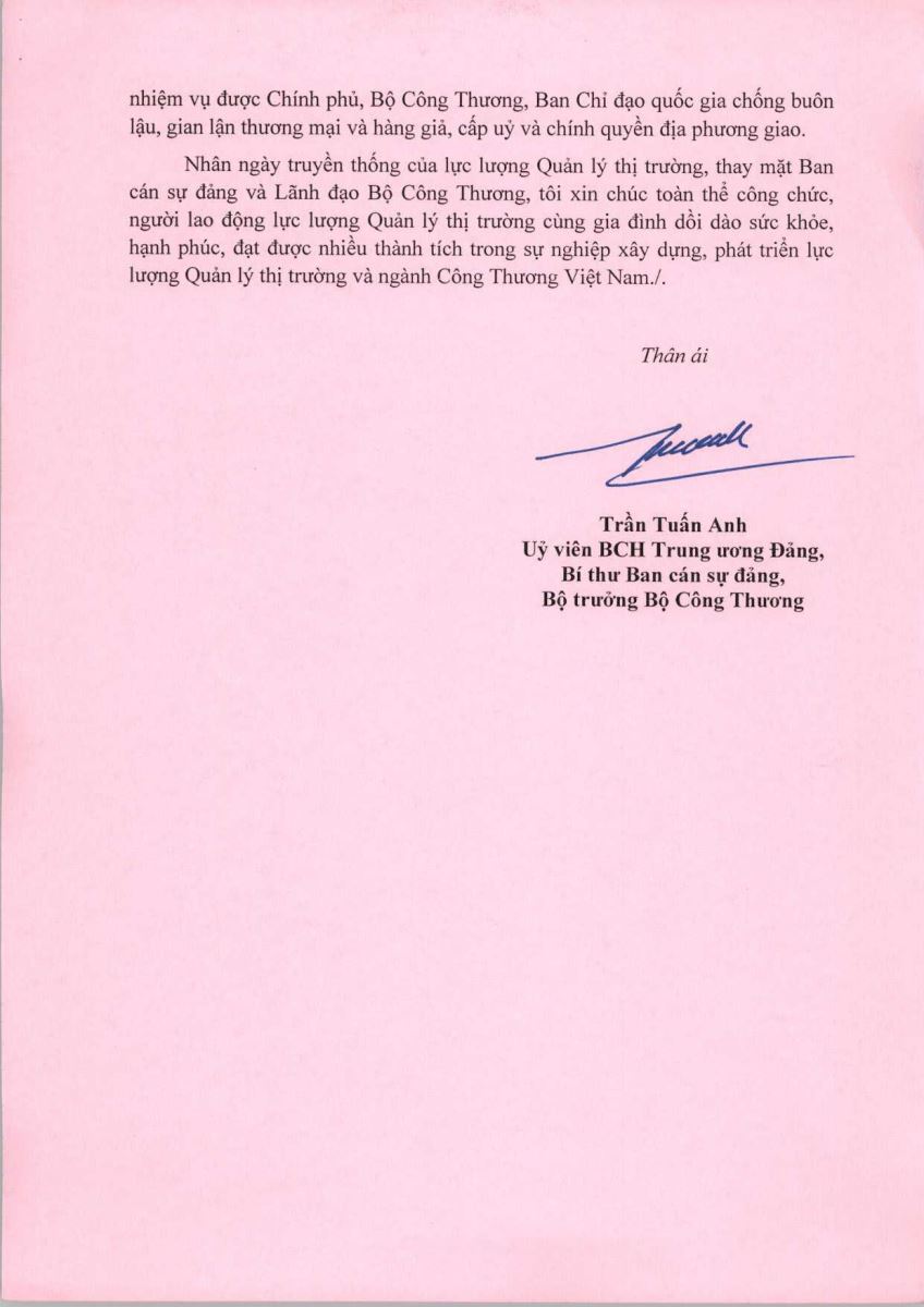 Nhân kỷ niệm 61 năm ngày truyền thống của lực lượng Quản lý thị trường (03/7/1957 – 03/7/2018), thay mặt Ban cán sự đảng và Lãnh đạo Bộ Công Thương, tôi xin gửi tới các thế hệ công chức, người lao động công tác trong lực lượng Quản lý thị trường lời chúc mừng tốt đẹp nhất.