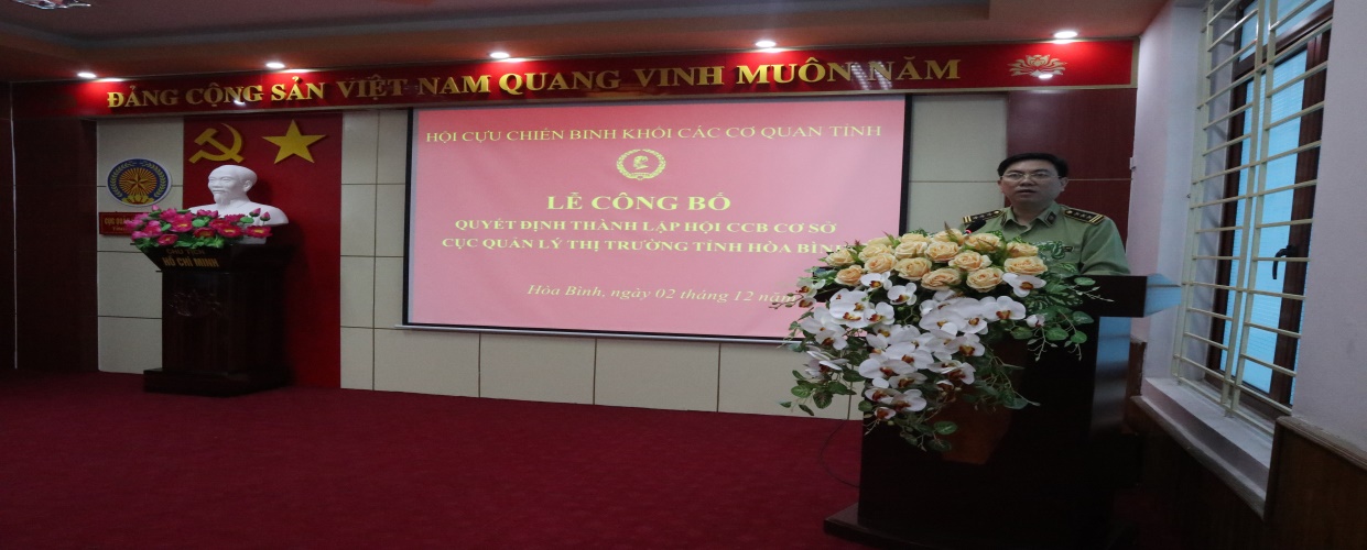 Chiều ngày 02/12/2020, tại Hội trường Cục QLTT tỉnh Hòa Bình. Hội Cựu chiến binh Khối các cơ quan tỉnh Hòa Bình đã tổ chức Lễ công bố quyết định thành lập Hội CCB cơ sở Cục QLTT.